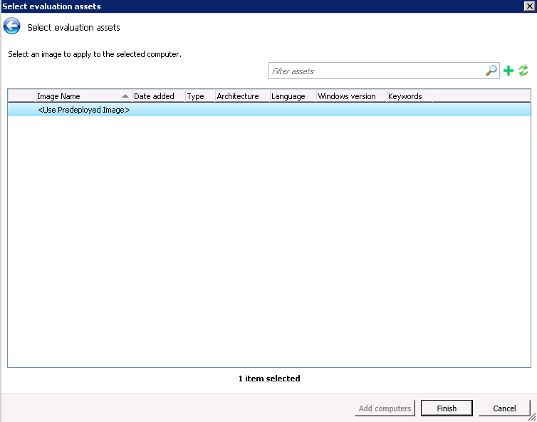 Time to configure the job, select Assets and press Add… to add your computer and select “Use Predeployed Image” ![]()
