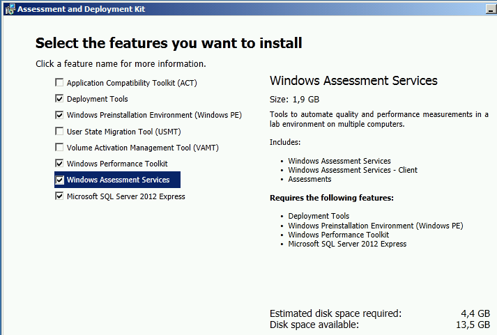 I would carefully read the requirements before starting the installation. Now time to start the ADKSetup.exe and select these features: