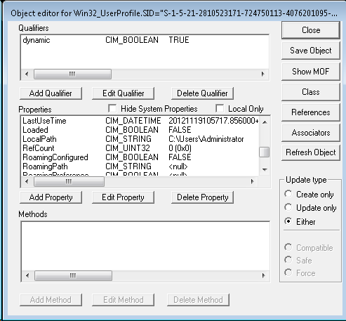 > $UserProfile = Get-WmiObject -Class Win32_UserProfile -ComputerName Localhost -Filter "LocalPath='c:\\Users\\User10'" > $UserProfile.PSBase | Get-Member TypeName: System.Management.Automation.PSMemberSet Name MemberType Definition ---- ---------- ---------- Disposed Event System.EventHandler Disposed(System.Object, System.EventArgs) Clone Method System.Object Clone() CompareTo Method bool CompareTo(System.Management.ManagementBaseObject otherObject, S... CopyTo Method System.Management.ManagementPath CopyTo(System.Management.Management... CreateObjRef Method System.Runtime.Remoting.ObjRef CreateObjRef(type requestedType) Delete Method System.Void Delete(), System.Void Delete(System.Management.DeleteOpt... Dispose Method System.Void Dispose() Equals Method bool Equals(System.Object obj) Get Method System.Void Get(), System.Void Get(System.Management.ManagementOpera... GetHashCode Method int GetHashCode() GetLifetimeService Method System.Object GetLifetimeService() GetMethodParameters Method System.Management.ManagementBaseObject GetMethodParameters(string me... GetPropertyQualifierValue Method System.Object GetPropertyQualifierValue(string propertyName, string ... GetPropertyValue Method System.Object GetPropertyValue(string propertyName) GetQualifierValue Method System.Object GetQualifierValue(string qualifierName) GetRelated Method System.Management.ManagementObjectCollection GetRelated(), System.Ma... GetRelationships Method System.Management.ManagementObjectCollection GetRelationships(), Sys... ...