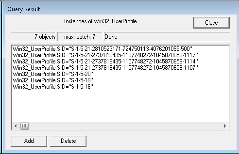 First we try the Get-WmiObject command to list all of our User Profiles, if you compare the results it will be the same as in WBEMTEST
