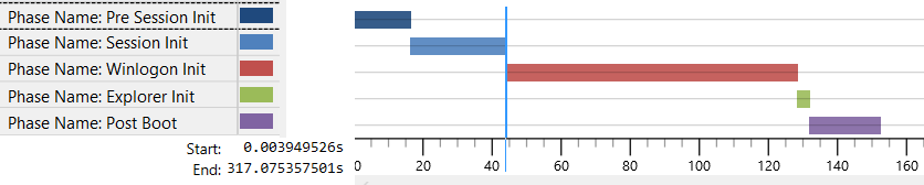 The boot consists of 5 phases during boot: Pre Session Init, Session Init, Winlogon Init, Explorer Init and Post boot. Here are some details about these phases: Windows On/Off Transition Performance Analysis
